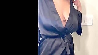 Curvy boss in stockings and high heels shakes her massive boobs in pantyhose